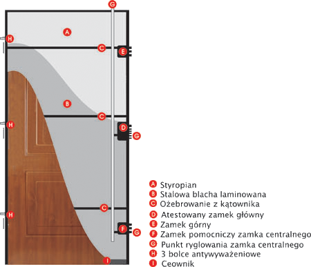 - zamek dodatkowy dolny (trzy ruchome rygle);