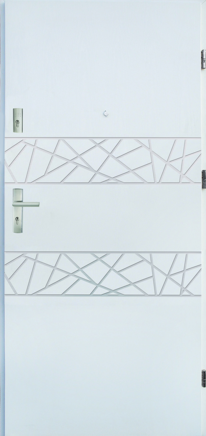 Wprowadzoną przez nas nowością jest możliwość zamówienia (za dopłatą) modelu ze skrzydłem w dwóch kolorach (innym od strony klatki, innym od mieszkania). Drzwi można nabyć w wersji z okuciami, która – oprócz standardowych elementów – wzbogacona jest klamką i rozetą Mati, wkładką oraz wkładką z gałką.