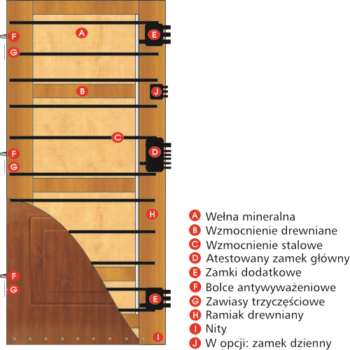 Skrzydło drzwiowe o grubości 50 mm wykonane jest z blachy ocynkowanej laminowanej w strukturze drewna lub lakierowane według palety RAL, wypełnione wełną mineralną oraz wzmocnione specjalnymi kształtownikami. Drzwi wyposażone są w zamek wpuszczany wielopunktowy, trzy zawiasy Z5, trzy bolce antywyważeniowe, ościeżnicę w kolorze skrzydła (laminowaną lub lakierowaną), uszczelkę pęczniejącą oraz okucia jak w drzwiach Batory.