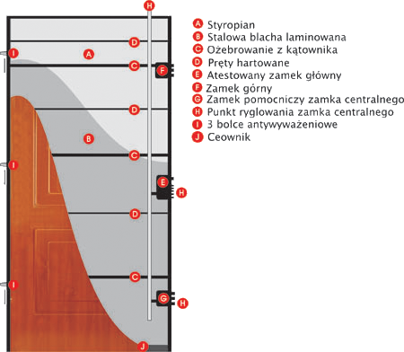 Skrzydło drzwiowe o grubości 45 mm wykonane jest z blachy ocynkowanej laminowanej w strukturze drewna lub lakierowane według palety RAL, wypełnione styropianem oraz wzmocnione specjalnymi kształtownikami.