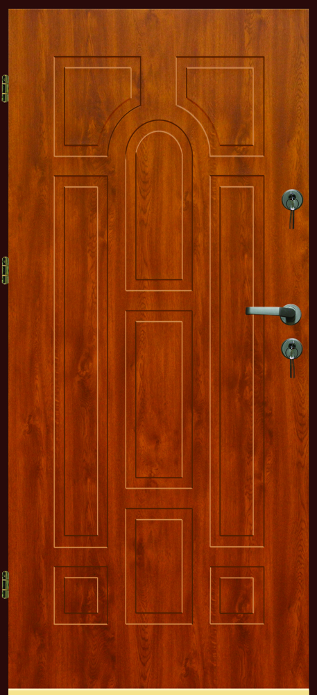 Skrzydło drzwiowe o grubości 45 mm wykonane jest z blachy ocynkowanej laminowanej w strukturze drewna lub lakierowane według palety RAL, wypełnione styropianem oraz wzmocnione specjalnymi kształtownikami.