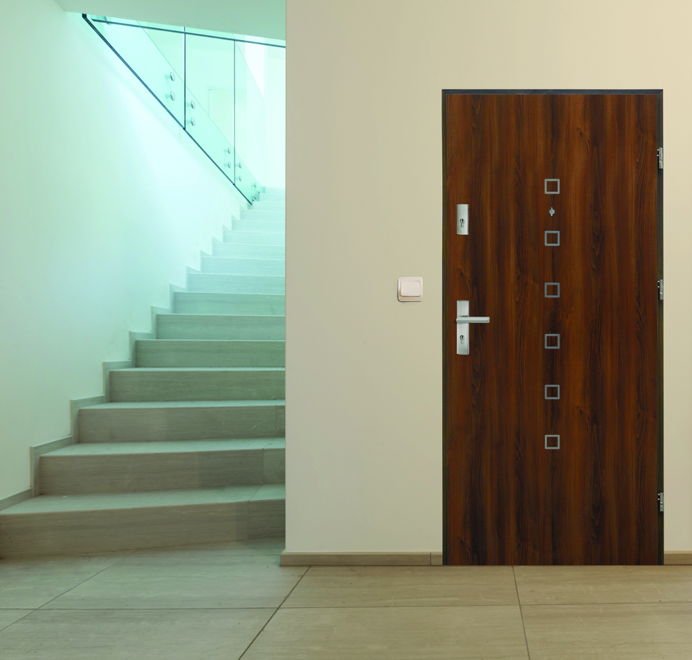 Drzwi o oznaczeniu Bastion I-45 ozdobione zostały symetrycznie ułożonymi kwadratami ze stali nierdzewnej, co nadaje im uniwersalnego, ale i nowoczesnego wyglądu. Do tego dochodzi ich wyjątkowa trwałość – wg normy PN-EN 1192:2001 odpowiadają one 3 klasie drzwi, co oznacza, że mogą być użytkowane także w ciężkich warunkach. Aby to było możliwe, wykonaliśmy ich ramę z drewna iglastego, wzmacniając ją dodatkowo aluminiowym profilem. W jej wnętrzu umieściliśmy dźwiękoszczelną płytę, dzięki której drzwi gwarantują spokój i prywatność – ich dźwiękoszczelność dochodzi do 32 dB. Drzwi oklejono frezowaną płytą MDF o grubości 6 mm, a jako wierzchniej warstwy użyliśmy wytrzymałej, 0,35-mm folii dekoracyjnej. Gwarancję, że drzwi wytrzymają lata w świetnym stanie, daje także zastosowanie w procesie ich produkcji technologii okleinowania bez łączenia na krawędziach przylgi.