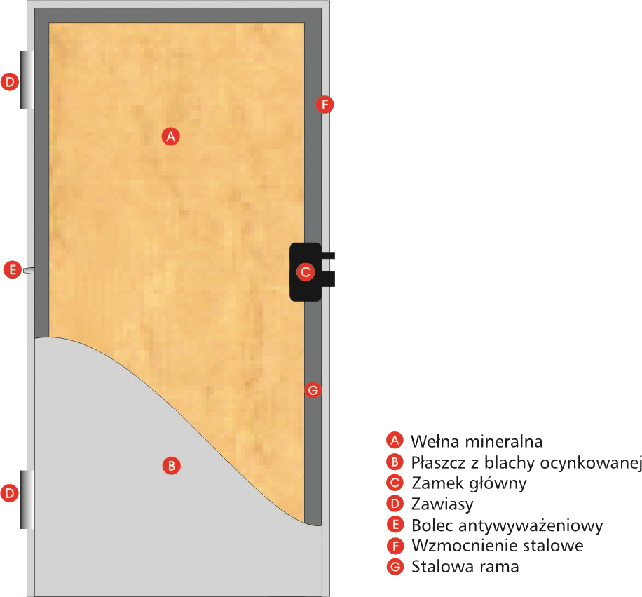 Skrzydło drzwiowe o grubości 60 mm wykonane jest z arkuszy blachy ocynkowanej o grubości 0,7 mm połączonej ze sobą, wzmocnione jest specjalnymi kształtownikami ze stali. Wypełnienie stanowi wełna mineralna.